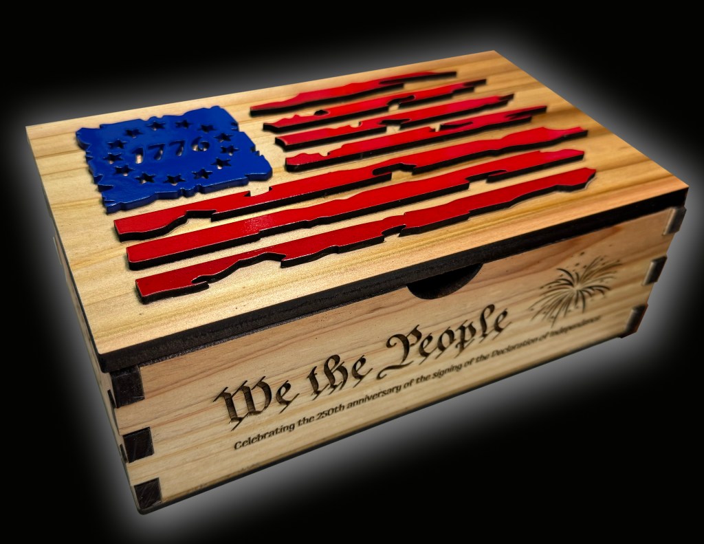 This my latest project ... The Betsy Ross Desk Top Organizer ... This finger joint box is made out of western cedar wood, laser cut and engraved with ... "Celebrating the 250th Anniversary of the signing of the Declaration of Independence" along with We the People, and a fireworks star burst. Betsy Ross Battle Torn Flag on top is laser cut out of Eucalyptus White Hardboard, painted, glued in place then coated with 2 coats of urethane. It measures 5" x 8 5/8" x 3" is tissue wrapped then packed in a white card board box. How it's Made https://youtu.be/aGbR-oKLkNM The Betsy Ross Desk Top Organizer is priced at $38.50 plus a small shipping fee. This is the Perfect Patriotic Gift! The link below will take you to my shop on Etsy. Thank You for your interest.
